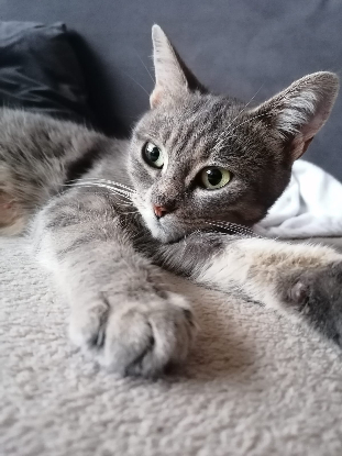 Une gentille chatte qui s'est très bien acclimatée à la vie de famille (à croire qu'elle connaissait déjà). Pas de crainte avec les humains même si elle ne les connaît pas.