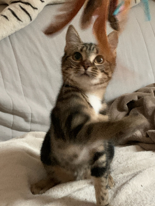 J'adore jouer et l'interaction avec l'humain; j'apprécie de plus en plus les caresses et je communique avec ma famille d'accueil.