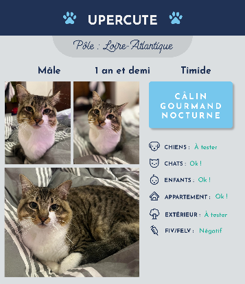 Bonjour chère famille, Je suis Upercute, un adorable chat de 1 an et demi à la recherche d'un nouveau foyer chaleureux. Actuellement en famille d'accueil, j'ai découvert que derrière ma timidité se cache un compagnon extrêmement affectueux qui raffole des caresses. Bien que je puisse prendre un peu de temps pour m'habituer à un nouvel environnement, votre patience sera grandement récompensée par mon amour inconditionnel. Durant la journée, j'aime me pelotonner sous les couettes des lits, créant ainsi un cocon douillet où je peux m'assoupir paisiblement. La nuit, je deviens un explorateur curieux, appréciant de me promener, savourer de délicieux repas et réclamer des moments de tendresse. Ayant grandi aux côtés de mes frères et sœurs pendant un an et demi, je m'entends bien avec d'autres copains, je suis un grand joueur! L'idée de partager mon espace avec d'autres camarades me ravit. Bien que j'aime la chaleur du foyer, je pourrais essayer de découvrir le monde extérieur, à condition que les câlins soient au rendez-vous! À très bientôt pour partager d'innombrables moments de bonheur,