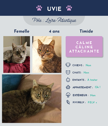 Bonjour ! Moi c'est Uvie, je suis douce, câline et attachante. J'ai quatre ans et je suis très timide au premier abord car ma vie passée n'a pas été simple, mais si vous me laissez le temps d'avoir confiance en vous, je vous dévoilerai ma nature très câline, joueuse et même rigolote ! J'aime faire ma sieste dans des petites cachettes secrètes mais dès que vous entrez dans la pièce je grimpe sur vos genoux pour vous faire la fête ! J'adore les gratouilles sur les hanches et frotter ma tête dans vos mains. Aussi je sais respecter votre espace et si vous voulez que je reste calmement près de vous, je saurais me montrer calme et tendre. D'ailleurs même si parfois je suis très impressionnée, je reste toujours douce, je ne griffe ni ne mords jamais, je préfère me cacher juste le temps que le danger s'éloigne. Sinon, j'aime faire ma toilette, boire dans votre verre d'eau et jouer avec les jouets à plumes ! Ma famille d'accueil dit que je suis rigolote car quand je suis excitée je fais une petite danse ! Dans la vie future j'aimerai avoir un grand arbre a chat pour regarder la vie dehors et écouter mon environnement avec attention. Aussi, je dois vous dire que dans ma vie d'avant j'ai attrapé la leucose. Pour protéger ma santé et celle des autres chats, je dois rester au chaud a l'intérieur, c'est pour ça que j'aimerais un super arbre a chat pour voir dehors. J'ai beaucoup d'amour a donner et j'ai hâte de rencontrer les humains bienveillants avec lesquels on deviendra une vraie famille pour la vie!