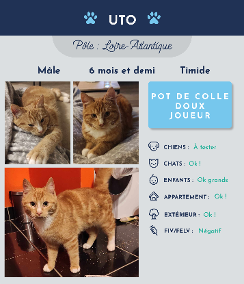 Salut, moi c'est Uto ! Avec mon poil flamboyant et ma super bouille, je ne passe pas inaperçu. Je suis un chat très gentil et affectueux. J'aime venir me coller à vous et ronronner à fond. La moindre caresse et le moteur démarre (il démarre même dès que je vois mes humains en fait