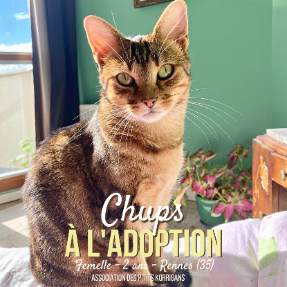 Aujourd’hui Chups est une jeune minette de 2 ans, radieuse, dynamique, intelligente. Elle adore grimper et sauter, c’est une frimousse très agile. Mais ce qu’elle aime particulièrement c’est jouer, pour s’épanouir elle aura besoin d’un environnement enrichi de séances de jeu quotidiennes en compagnie de copains chats ou d’humains.
