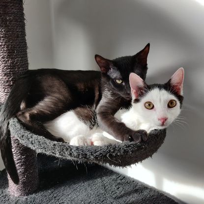 - Podcolle (noir) est un mignon petit chaton très câlin et proche de son humain. Il adore jouer avec Podglue et adore se mettre dans le cou de sa famille d'accueil pour ronronner et lui faire des léchouilles !