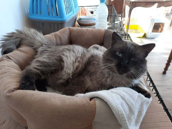 Trouvé errant avec un numéro de puce électronique étrangère qui n'était pas enregistrée, il a fallu assurer chaque mois des rendez-vous vétérinaires pour le suivi sanitaire afin qu'il puisse enfin être mis à notre nom.