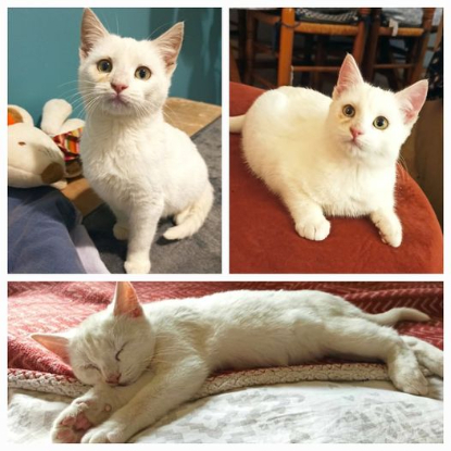 Adore les câlins, ronronne et aime les parties de jeux.