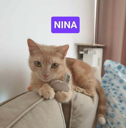 Nina, Jolie chatte marbrée d’un roux tendre, adore dominer la situation du haut d’un arbre à chat ou d’un meuble.