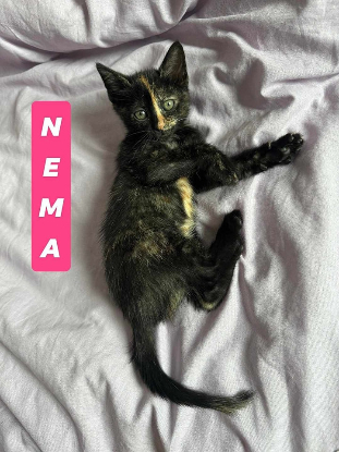 Nema est une adorable petite chatonne âgée de deux mois. Elle est câline, joueuse, rigolote et très bavarde, une véritable pile électrique ! Nema est aussi très gourmande, elle aime beaucoup la pâtée.