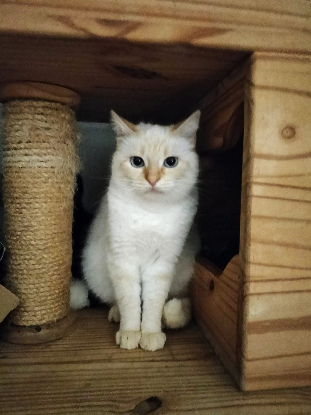 Parfois j’y retrouve des bruits familiers : les miaulements perçants de mes congénères, le fracas des jeux endiablés, le ronronnement mélodieux d’esprits apaisés… Alors pour m’approprier ce monde, je les copie, j’essaye de faire comme eux, timidement mais bravement, dans cet univers qui m’effraie et me plait à la fois. La présence bénéfique d’un congénère m’est d'ailleurs indispensable.