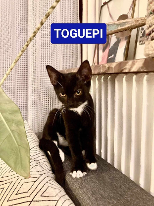 Toguepi est un chaton très sociable qui vit avec un autre chat compagnon de jeu et de sieste. Il s’entend très bien avec tous les humains qu’il a rencontrés dans sa famille d’accueil et n’hésite pas à venir dire bonjour dès que le réveil sonne en ronronnant comme un petit moteur ! Dans chaque pièce où vous irez, Toguepi vous suivra mieux que votre ombre.