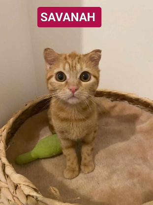Savanah est une jolie chatonne rousse âgée de 5 mois. Elle est câline et très proche de l'homme. Elle a de drôles de petites oreilles qui lui font un charme fou ! Elle est calme, assez discrète, propre et elle aime beaucoup dormir près de son humain ! C'est une chatonne adorable et très facile à vivre.