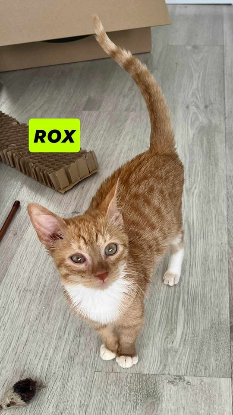 Rox est un petit chaton roux et blanc mâle aux yeux verts âgé de 4 mois et demi.