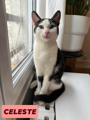 Chatte à la robe blanche et noire, avec des yeux verts. Très affectueuse et gourmande, elle est active, curieuse et très sociable. Elle aime jouer, elle est propre et ronronne très souvent. Elle s’adapte et fait confiance rapidement. Elle suit les humains d’une pièce à l’autre, un vrai pot de colle !