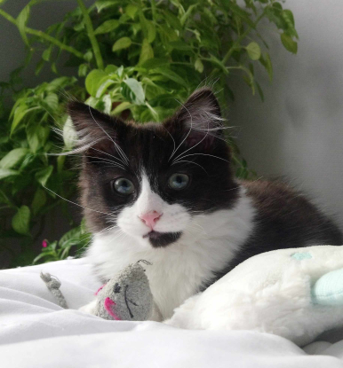 Plein de vie, dynamique et joueur, il court et saute partout (rideaux et plantes vertes y compris) et est maître dans l’art des bêtises… Un chaton dans toute sa splendeur !