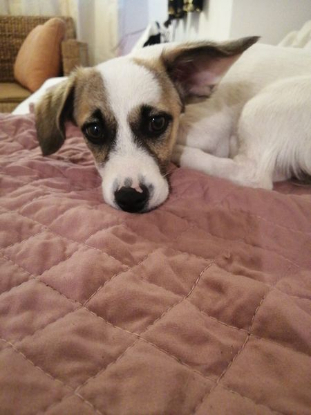 Choupie est âgée de 3 mois et demi et pèse 3 kilos 600 (petite taille). Elle est croisée jack russel.