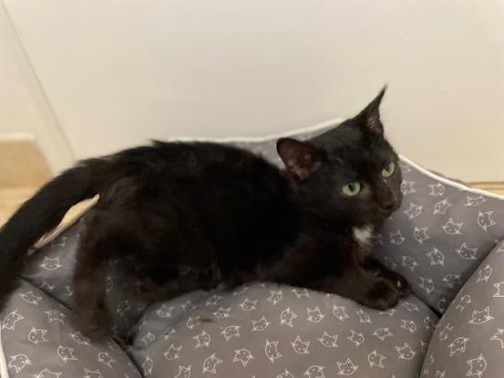 Bombydou est une chatonne sauvée chez une personne qui ne s'occupait pas de ses chats. Elle a de jolis yeux verts, elle est joueuse et très câline.