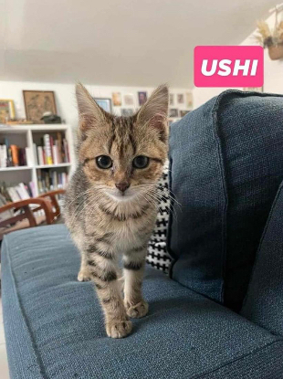 Ushi est une chatonne tigrée de 3 mois super joueuse. Curieuse de tout, elle ira explorer les moindres recoins de votre appartement et jouera avec tout ce qu’elle trouvera sur son chemin. Sa maladresse vous fera craquer à tout les coups. Pas farouche du tout, elle ne se laisse pas impressionnée par son nouvel environnement ou bien, les autres chats si vous en avez.
