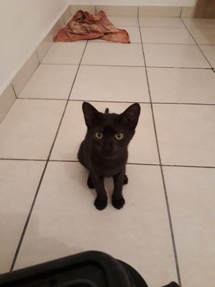 Noiraude alias Gremlins : Elle a été trouvée à la Clinique les orchidées à Le Port dans un piteux état début janvier. On me l'a amenée le samedi 4/01 début d'aprem et heureusement dans la soirée, je devais aller voir le véto de l'APPAR avec tous les chatons. Arrivée là bas, elle n'était pas bien, hypothermie, déshydratée les fesses en choux fleur, diarrhée, odeur pestilentielle. La veto lui a fait une piqûre de sérum physiologique pour la réhydrater. Elle avait 50 % de chance de survie. Donc je l'ai maintenue au chaud contre moi la moitié de la nuit et continué de lui faire ses piqûres toutes les 12 heures. Le lundi, on l'a hospitalisée pour sa diarrhée. Et la puce a survécu. Elle ronronne beaucoup. Et très joueuse, mais n'aime pas trop être portée pour le moment.