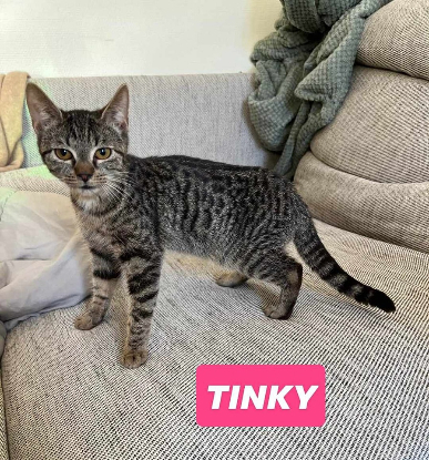 Tinky est une chatonne tigrée amatrice de séances câlin sur le dos. Elle est très gourmande alors attention si vous n’êtes pas du genre à partager vos frites. Elle préférera aussi boire l’eau dans une casserole laissée dans l’évier.