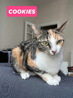 Cookies est un magnifique chatte tricolore avec un cœur aussi chaleureux que sa fourrure.