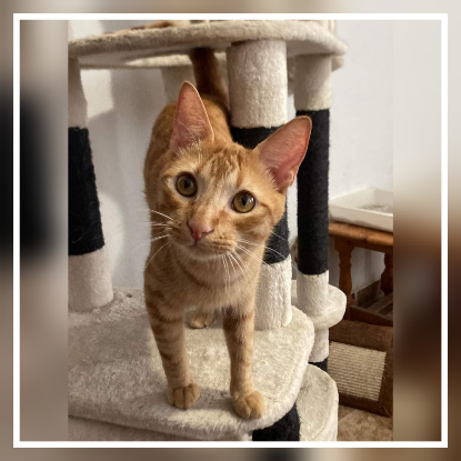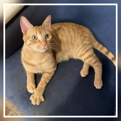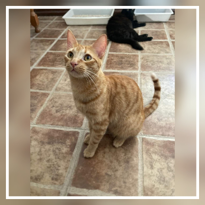 Il a été récupéré alors qu'il n'était encore qu'un bébé. Il aime la présence des humains. C'est également un chat très joueur. C'est une vraie machine à ronron.