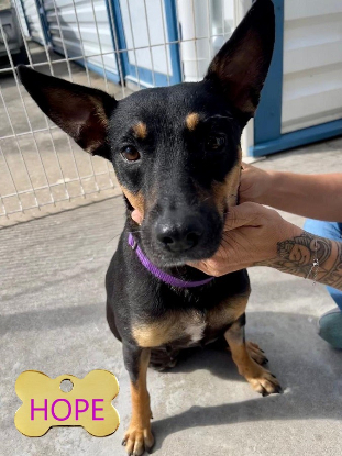 Malgré cette terrible épreuve, Hope est adorable, sociable avec les humains, les chiens, les chats, les iguanes et les poules.