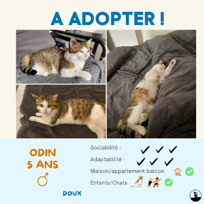 Odin est un loulou adorable qui méritait d’être sauvé. Certainement abandonné, Odin ne s’est pas laisser prier pour réclamer des câlins et ronronner de douceur. C’est un chat doux, patient, calme et aussi très intelligent. Il vous fera fondre d’amour avec ses beaux yeux jaunes. Odin c’est une force tranquille, un loulou qui ne vous demandera rien d’autre que de l’amour, beaucoup d’amour.