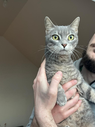 Ma robe est élégante, tigrée/ grise aux couleurs pastels (diluées), les yeux verts.