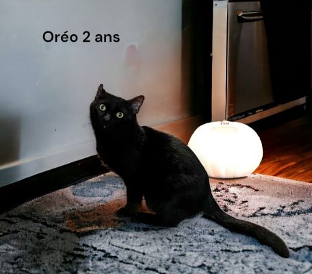Oréo, 2 ans, est un minou noir avec un profil atypique à cause de son oreille atrophiée. Il est en bonne santé, il est affectueux et câlin, il aime venir sur les genoux. C'est aussi un gourmand.