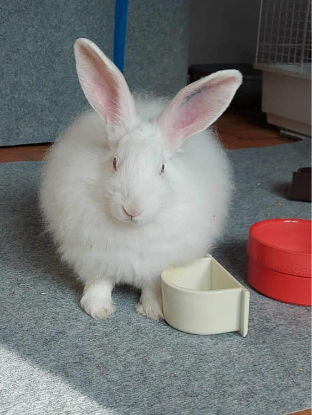 Fanfreluche est une jeune lapine très dynamique, curieuse et proche de l'humain. Elle a besoin de vivre en intérieur, sa fourrure angora nécessite des brossages réguliers et des visites régulières chez le toiletteur.