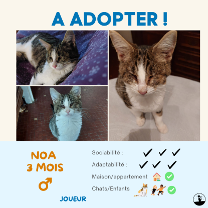 Noa c’est un chat pas comme les autres. Il a énormément de qualités, qui le rendent au quotidien extrêmement adorables. Il fera le bonheur de sa famille adoptive, sans aucun doute !