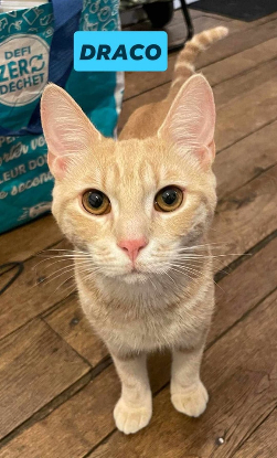Draco est un chaton roux âgé de 5 mois débordant d’énergie et de charme. Rapidement à l’aise il explore son environnement avec une curiosité sans limite. Vrai pot de colle il se blottit volontiers dans les bras de ses compagnons humains, recherchant constamment leur affection et leurs câlins. Petit fun fact, Draco adore faire des bisous ! Ce petit félin est aussi incroyablement joueur. Pour son épanouissement, Draco aura besoin d’un copain chat. Cependant il pourrait être adopté seul si beaucoup de présence humaine.