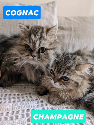 Nous vous présentons deux frères de 7 mois typés persan (nés fin août 2023) ; Champagne et Cognac. Ils se ressemblent énormément physiquement. OK avec les enfants.