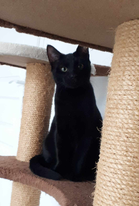 Je suis sociable avec mes congénères. Je suis une jolie petite panthère noire un peu sauvage : je ne suis pas du tout agressif mais l'humain me fait encore un peu peur alors je vais me cacher. Les câlins c'est pas encore trop mon truc, mais si vous avez un peu de patience, ça viendra avec le temps ! Je suis encore un bébé et j'ai beaucoup de choses à apprendre.