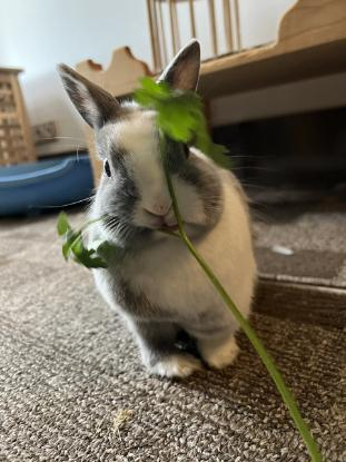Comportement : Chanelle est une lapine curieuse, sociable et bien active. Elle a récemment perdue sa copine Coco mais continue à venir voir sa fa, toujours en tête pour des caresses, sauter et s’asseoir sur vos genoux, mais comme la plupart des lapins, elle n’aime pas être soulevée. Chanelle avec sa jolie bouille d’ange adore grimper et se faufiler dans de petits espaces, donc son espace de vie doit être à l’épreuve des lapins. Chanelle adore grignoter des choses, surtout des tissus.