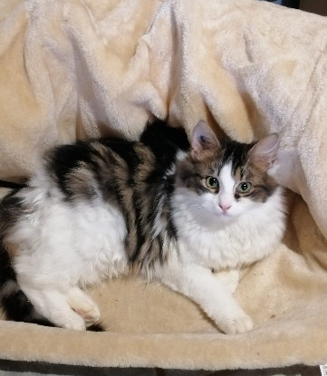 Ici avec une de ses soeurs Uriana encore un peu craintive , c'est un grand chaton dont l'âge est estimé à 8 mois qui s'est révélé très vite sociable en famille d'accueil .