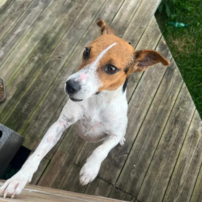 Son histoire par sa famille d'accueil  : Un jour de tempête, alors que j’entrais chez moi pour préparer le cyclone, je l’ai aperçue la queue entre les jambes dans un coin, elle était méconnaissable par rapport à aujourd’hui (affection totale du pelage, malnutrition, chien très très peureux…), je l’ai attirée avec confiance pour la mettre en sécurité chez moi, et nous avons cohabité pendant la durée de la tempête et elle a compris qu’elle était en sécurité … joueuse et coquine, elle est tout simplement devenue très vite irrésistible.