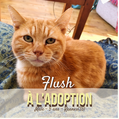 Flush a 5 ans. Il a été recueilli par l'association de protection animale ADPK (Association Des P'tits Korrigans). L'ADPK met tout en oeuvre pour recueillir et soigner des animaux abandonnés, mais aussi pour assurer une expérience positive d'adoption pour l'animal chat et pour ses futurs humains afin de réaliser des adoptions responsables réussies. Ainsi, nos bénévoles accompagnent les adoptants tout au long de leur projet d'adoption pour s'assurer de l'adéquation des profils adoptant / adopté et apportent tous les conseils nécessaires pour que l'adoption se déroule dans les meilleures conditions possibles.