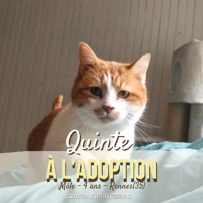 Quinte a 4 ans. Il a été recueilli par l'association de protection animale ADPK (Association Des P'tits Korrigans). L'ADPK met tout en oeuvre pour recueillir et soigner des animaux abandonnés, mais aussi pour assurer une expérience positive d'adoption pour l'animal chat et pour ses futurs humains afin de réaliser des adoptions responsables réussies. Ainsi, nos bénévoles accompagnent les adoptants tout au long de leur projet d'adoption pour s'assurer de l'adéquation des profils adoptant / adopté et apportent tous les conseils nécessaires pour que l'adoption se déroule dans les meilleures conditions possibles.