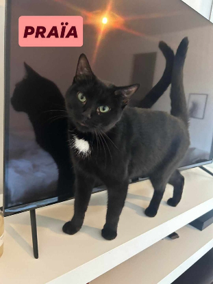Jolie minette toute noire avec un petit médaillon blanc, Praïa se distingue par sa nature câline malgré sa timidité.
