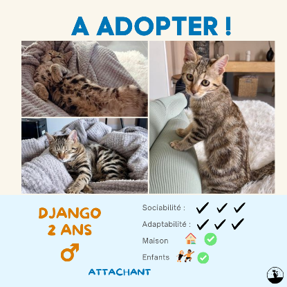 Avec ses beaux yeux comment ne pas craquer pour Django ? Le loulou est un amour de chat. Encore très jeune, c’est un joueur dans l’âme ! Avec toute son énergie, Django adore galoper, sauter sur l’arbre à chat, attraper une mouche qui vole. En bref, Django a besoin d’espace pour être parfaitement heureux. Et quand il ne joue pas, Django câline sans fin ses humains. Tout ça le rend excessivement attachant.
