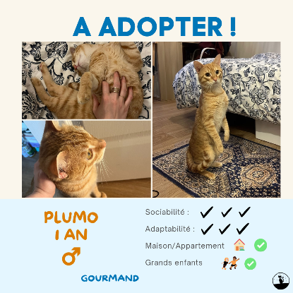 Laissez-vous convaincre par Plumo et sa jolie frimousse. Ce petit coeur est un tout jeune rouquin, joueur, gourmand, et câlin. Plumo c’est un jeune chat qui croque la vie à pleine dent, très curieux de tout, il adore découvrir de nouvelles choses (jeux, odeurs, saveurs, tout y passe). Tout est un jeu pour Plumo, et rien de mieux qu’un humain pour jouer avec lui ! A côté de ça, Plumo est un chat extrêmement gourmand. Il remplira votre journée de douceur avec ses beaux yeux, et les câlins qu’il vous fera. Bref, un amour.