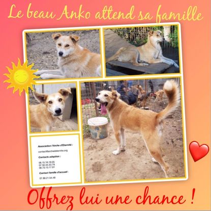 Anko est un super chien. Il adore nous sauter dessus pour attraper les friandises et prendre quelques caresses au passage . Il a besoin de quelques minutes pour se détendre mais une fois détendu, il s'ouvre et devient vraiment attachant. Il est beau et son regard captivant. il est aussi très intelligent et repère vite où il peut attraper les friandises de lui même dans le sac. Anko est prêt à intégrer une famille. Il est actuellement en refuge.