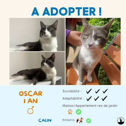 Si nous devions résumer Oscar en 3 mots : affectueux, doux, adaptable. En effet, Oscar est un jeune chat débordant d’amour et de tendresse. Il viendra vous faire des câlins le matin au réveil, l’après-midi sur le canapé, et le soir dans le lit. Oscar c’est ce chat calme et doux dont tout le monde rêve. Avec des enfants il est une crème. Un beau chat bien dans ses patounes et heureux d’avoir été sauvé !