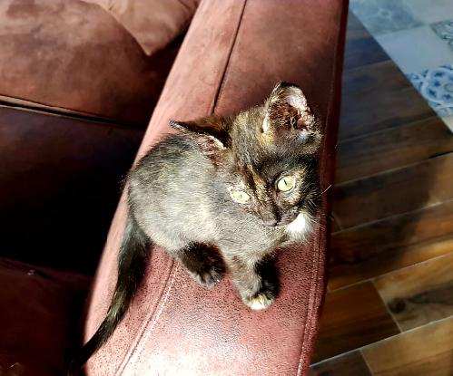 Elle n'a pas eu un début de vie facile : elle a été trouvée dans un carton avec son frère Tonic, sans maman ! Elle a bien sûr été biberonnée jusqu'à ce qu'elle se débrouille seule !