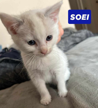 Soei est un chaton curieux et très sociable. Il n’hésite pas à aller vers les autres et à partager sa souris en peluche ou sa gamelle. Ce petit aventurier explore son environnement avec intérêt et est avide de câlins. C’est un amour qui aura probablement besoin de vivre avec un(e) copain(e) pour s’épanouir.