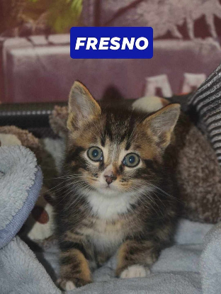 Fresno est un chaton tigré et blanc au pelage épais et à la petite tête adorable qui cherche un foyer chaleureux. Il est plutôt timide au début, mais une fois qu'il vous accorde sa confiance, il devient très affectueux et ne demande qu'à être câliné.
