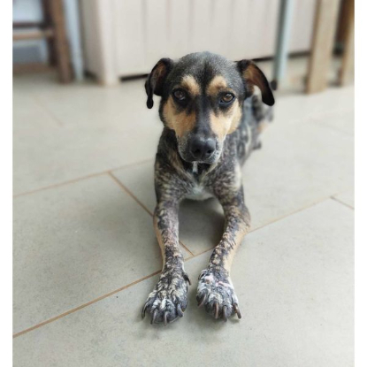 Il aurait 2 ou 3 ans (pour 9,5 kg) selon le vétérinaire. Et le traitement contre la gale a très bien marché sur lui Il est toujours en famille d’accueil chez Anne-Laure