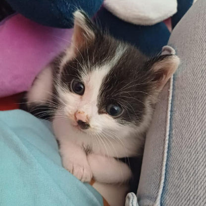 Nous accompagnons, depuis l'année dernière, Cécile, qui s'est engagée pour les chats errants de son quartier. Il y a eu des stérilisations et de adoptions de chatons mais 2 chattes n'ont pas pu être trappées et stérilisées et l'une d'entre elles a ramené 3 jolis petits chatons gris et blanc, 3 petits gars.