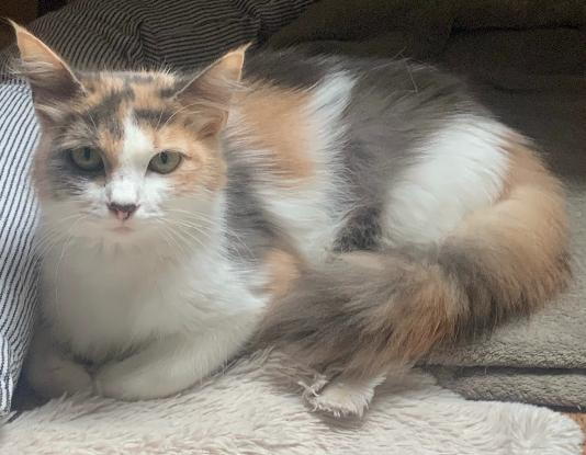 Poils mi longs, robe tricolore, toute en finesse, Topaze n’a pas que des qualités physiques puisqu'elle se révèle être une chatte sociable, qui succombe aux câlins.