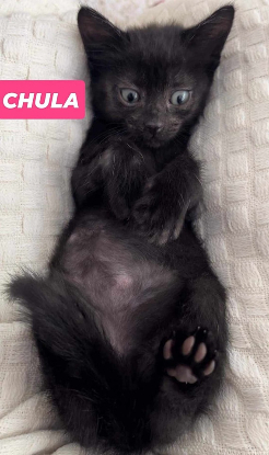 Chula, petite chatonne toute noire au regard bleu envoûtant, est la douceur incarnée. Toujours collée à l'humain, elle se faufile partout, adore s'installer confortablement dans les capuches de sweatshirt. Elle tisse des liens forts avec sa sœur Wichita et même avec nos fidèles chiens, se blottissant entre leurs pattes pour une nuit bien au chaud.